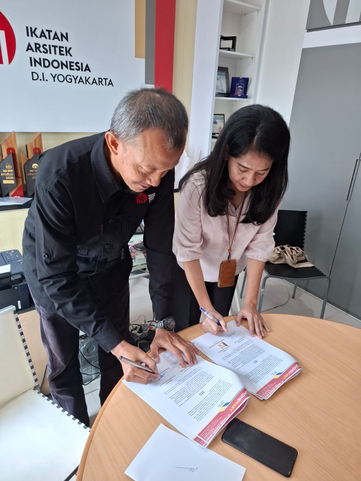Penandatanganan perjanjian kerjasama dilakukan oleh Ar. Erlangga Winoto, IAI, AA selaku Ketua IAI DIY dan Agatha Florensia selaku Executive Marketing Manager PT Qhome Sukses Abadi. Acara berlangsung di kantor IAI DIY, Yogyakarta, disaksikan oleh Henky, Direktur PT Qhome Sukses Abadi, serta sejumlah jajaran pengurus IAI DIY.